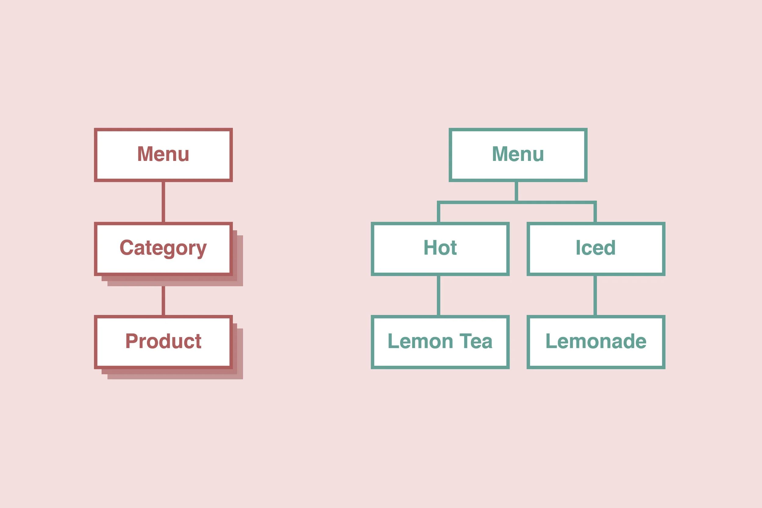 To do so, we have added categories. A menu can have multiple categories, and within each category there is at least one product.