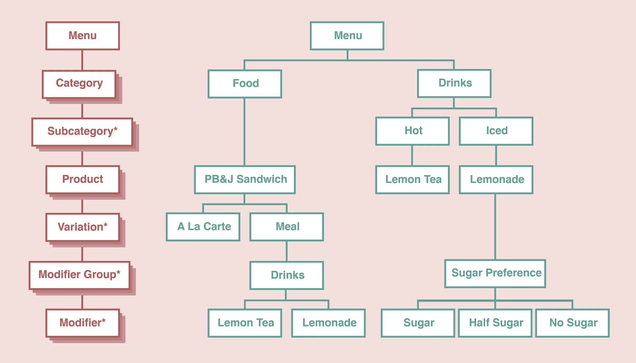 Modifiers are organized into groups called modifier groups. They are used to indicate a specific preference for a product or product variation. In the information architecture below, there are two modifier groups. The first named "Drinks" within the PB&J Sandwich Meal lets customers choose between Lemon Tea or Lemonade. The second modifier group called "Sugar Preference" allows customers to indicate how much sugar they want in their Lemonade.
