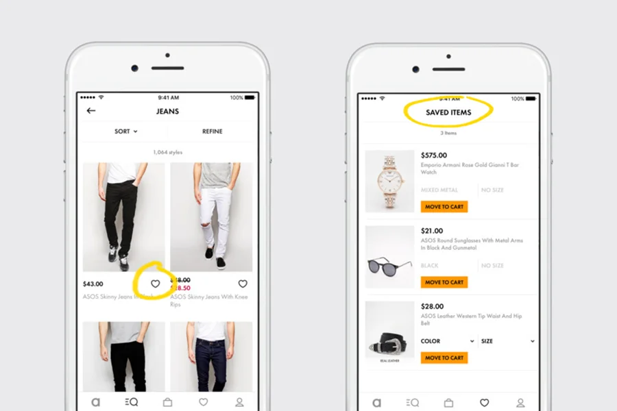 Users of the ASOS app can save items while browsing by tapping on the heart icon and see them in a list under 'Saved Items' so that it's easier to add them to cart when they are ready to purchase.