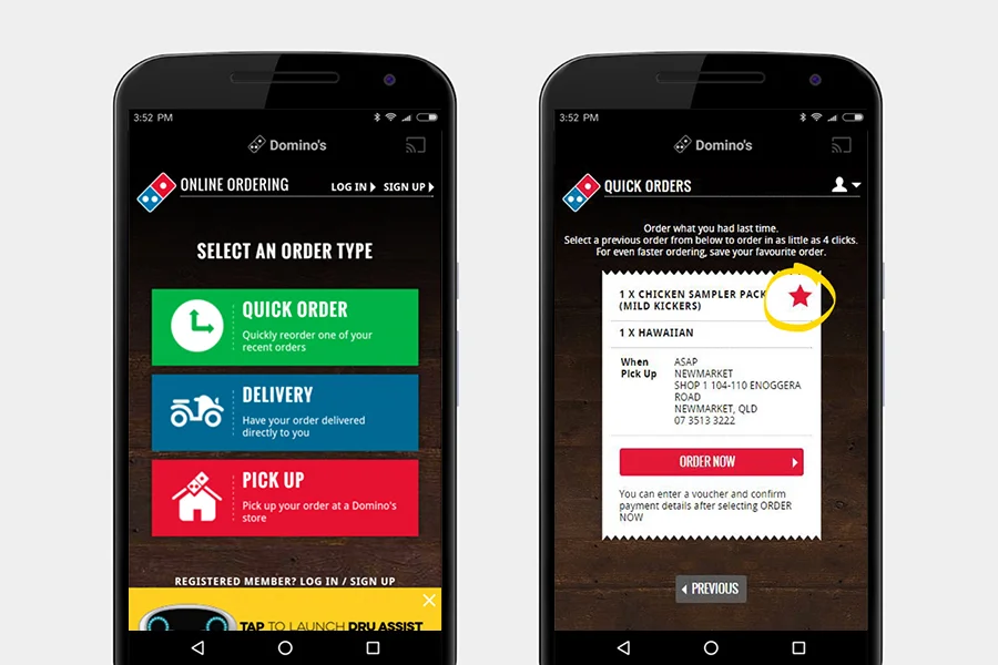The Domino's Pizza app in Australia has a similar favourite/save feature (the star icon), but with a twist. Instead of saving just the item, it saves the entire order, including delivery/collection and payment details.